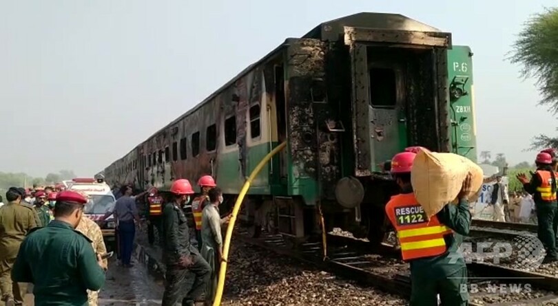 【10月31日 AFP】(更新、写真追加)パキスタン中部で31日、走行中の旅客列車が火災に見舞われ、少なくとも74人が死亡、数十人が負傷した。乗客が朝食を調理していたところ、ガスボンベが爆発したという。当局が明らかにした。