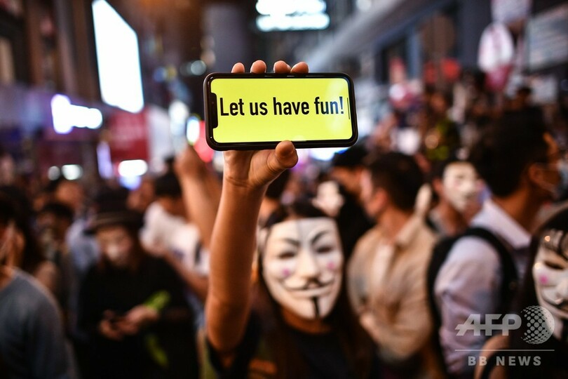 香港のデモは概して指導者がいないが、この日はハロウィーンをテーマにしたマスクで抗議するようインターネット上で呼び掛けがあった。