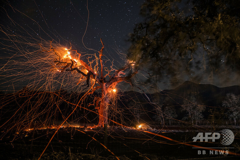 【11月11日 AFP】米カリフォルニア州ヒールスバーグ(Healdsburg)東部、ハイウエー128号線(Highway 128)近くに迫った山火事「キンケード火災(Kincade fire)」で燃える木を長時間露光撮影。