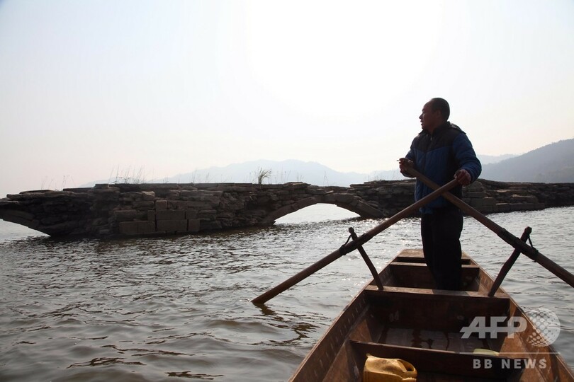仙女湖の水位が下がり500年前の「万年橋」が姿現す、中国・江西