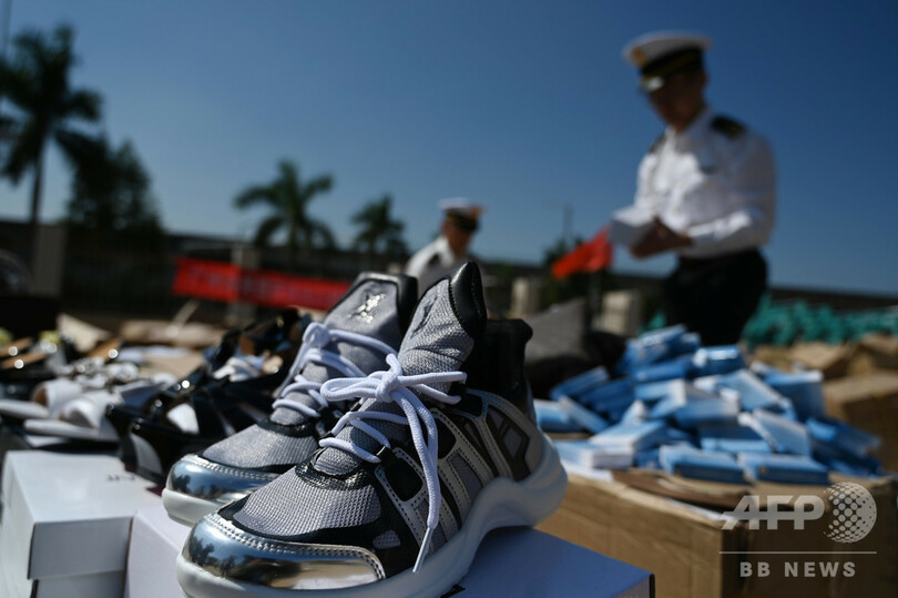 この日の処分は広州市南沙区(Nansha)で行われ、税関職員が違法商品を並べて処分したほか、ショベルカーも投入して権利侵害商品を集中的に処分した。(c)CNS/JCM/AFPBB News