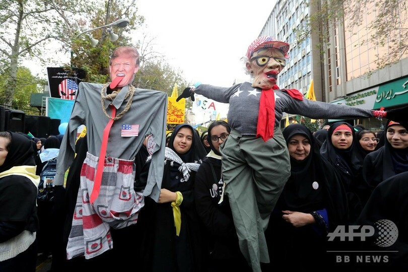 事件ではイラン革命を支持する学生らが大使館に突入、米外交官や警備員ら数十人を拘束した。事件発生から40年となったこの日、テヘランなど複数の都市で反米デモがあり、デモ参加者らは反米のシュプレヒコールを繰り返し、ドナルド・トランプ(Donald Trump)米大統領を模した人形を掲げて練り歩いた。