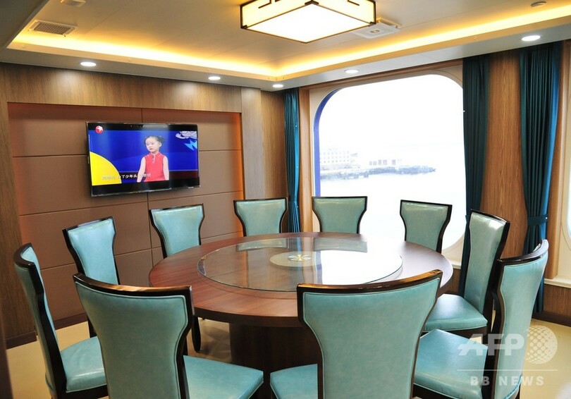 客室は複数の等級に分かれ、船上には多目的ホール、子どものプレースペース、屋外バー、シアターなどのレジャー施設を備えている。エレベーター3台が装備され、ヘリコプターも発着できる。(c)CNS/JCM/AFPBB News