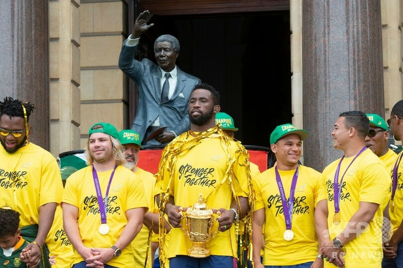 【11月12日 AFP】ラグビーW杯日本大会(Rugby World Cup 2019)を制したスプリングボクス(Springboks、南アフリカ代表の愛称)の優勝パレードが、11日に最終日を迎え、選手たちは、獄中生活を終えた故ネルソン・マンデラ(Nelson Mandela)元大統領が最初にスピーチを行ったケープタウン市庁舎で、熱狂的なファンを前にトロフィーを掲げた。