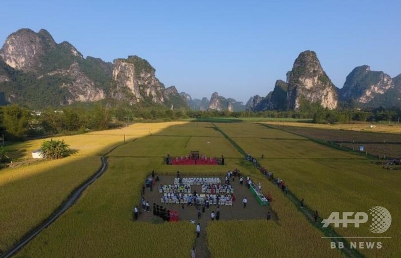 明仕田園風景区は8日、初めての収穫フェスティバルを開催され、1000人以上の観光客と地元の人々が少数民族チワン族の歌と踊りを鑑賞しながら、郷土料理を堪能した。魚を捕ったり鶏を追いかけてつかまえたりという昔ながらの遊びにも参加し、収穫を祝う民族文化をたっぷりと体験した。(c)CNS/JCM/AFPBB News