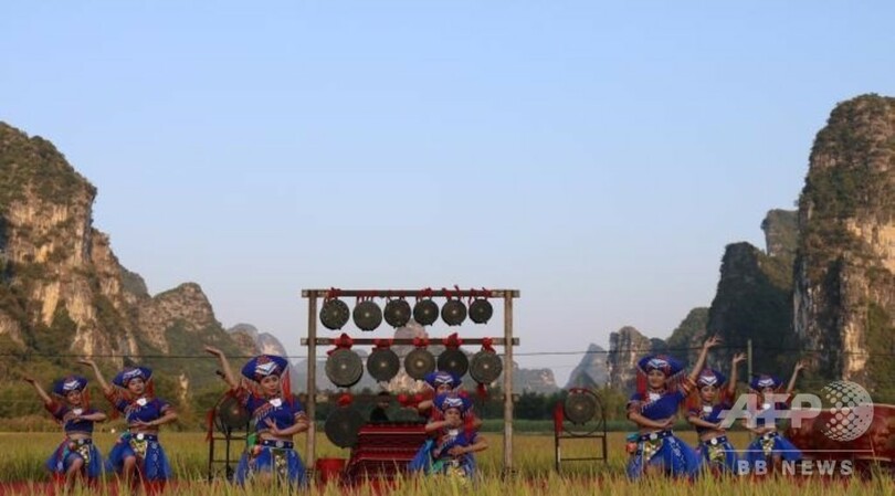 明仕田園風景区は8日、初めての収穫フェスティバルを開催され、1000人以上の観光客と地元の人々が少数民族チワン族の歌と踊りを鑑賞しながら、郷土料理を堪能した。魚を捕ったり鶏を追いかけてつかまえたりという昔ながらの遊びにも参加し、収穫を祝う民族文化をたっぷりと体験した。(c)CNS/JCM/AFPBB News