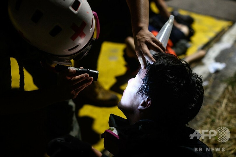 警察は最終的に放水車を使用したが、時折催涙弾を発射しながら撤収を始めた。真夜中が近づく中、キャンパスは引き続き仮設の防護壁の後ろに陣取ったデモ参加者らの手中に置かれた。(c)AFP/Su Xinqi and Jerome Taylor