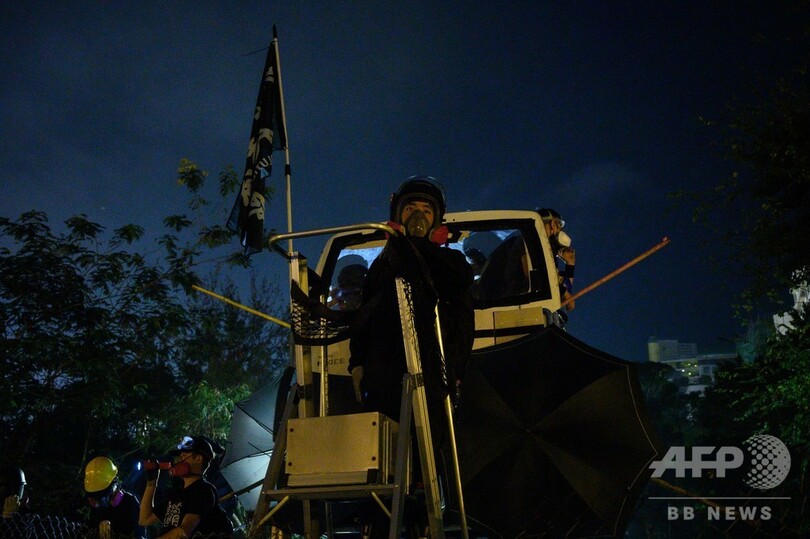 警察は最終的に放水車を使用したが、時折催涙弾を発射しながら撤収を始めた。真夜中が近づく中、キャンパスは引き続き仮設の防護壁の後ろに陣取ったデモ参加者らの手中に置かれた。(c)AFP/Su Xinqi and Jerome Taylor