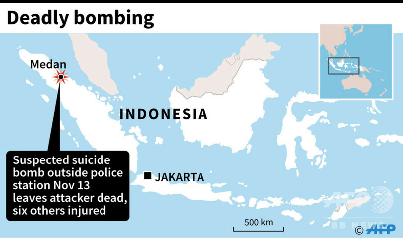 【11月13日 AFP】(図解追加)インドネシア・スマトラ(Sumatra)島にある警察署で、自爆とみられる爆発があり、少なくとも犯人1人が死亡し、6人が負傷した。当局が13日、明らかにした。