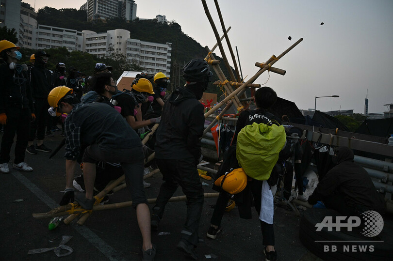 デモ隊は13日夜、同大学前にある中国本土と隣接する九龍(Kowloon)半島と香港の金融中心地をつなぐ主要トンネルを封鎖。警察に封鎖を突破された場合に備えて、投石機をトンネルの出入り口に向けた。