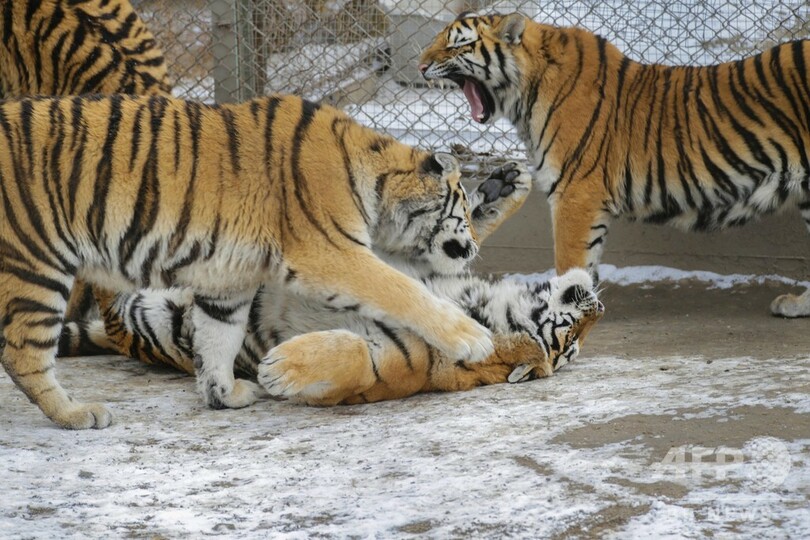【11月17日 CNS】中国・黒竜江省(Heilongjiang)ハルビン市(Harbin)では13日、立冬の後、初雪が降った。東北虎林園(Siberia Tiger Park)では、アムールトラたちが雪の中で戯れていた。(c)CNS/JCM/AFPBB News