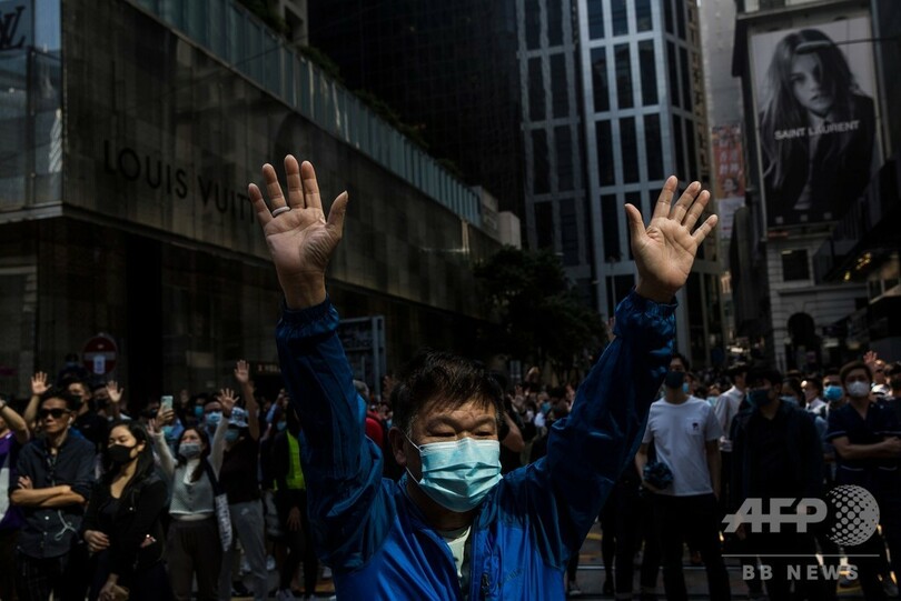 この日は会社員を中心とする数千人規模のデモとなった。参加者らは「香港を支持する」と声を上げながら、5本の指を広げた手を挙げた。普通選挙の実施や警察の暴力に対する独立調査委の設置などの「五大要求」を示すものだ。