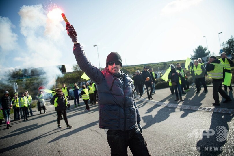 フランスの地方部では、デモは祭りのような雰囲気を醸し出していた。黄色いベストを身に着けた多くの参加者は、昨年マクロン氏の経済政策に対して抗議活動を開始した際に占拠した道路の交差点を再び訪れた。