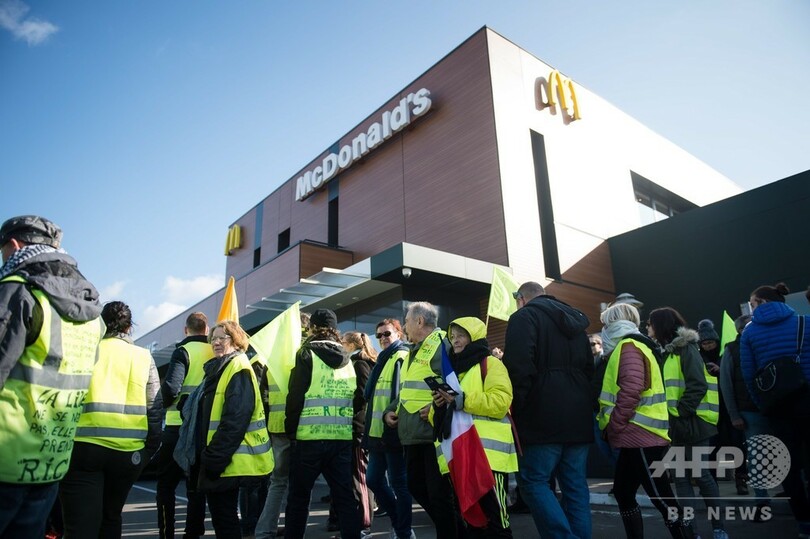 フランスの地方部では、デモは祭りのような雰囲気を醸し出していた。黄色いベストを身に着けた多くの参加者は、昨年マクロン氏の経済政策に対して抗議活動を開始した際に占拠した道路の交差点を再び訪れた。