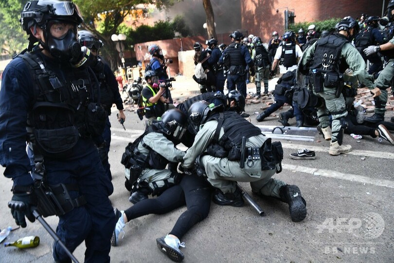【11月18日 AFP】香港では18日、週末にかけて大学を占拠していた強硬派のデモ参加者数百人を警察が排除しようとする中、機動隊は大学から脱出しようとした民主派のデモ参加者を次々と拘束した。