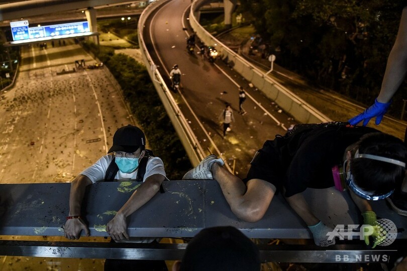 【11月18日 AFP】(写真追加)香港で18日、民主派のデモ隊が占拠し、当局に包囲されていた大学から、数十人のデモ参加者らがロープを伝って歩道橋から幹線道路に下りて脱出する様子が、AFPの動画に捉えられた。