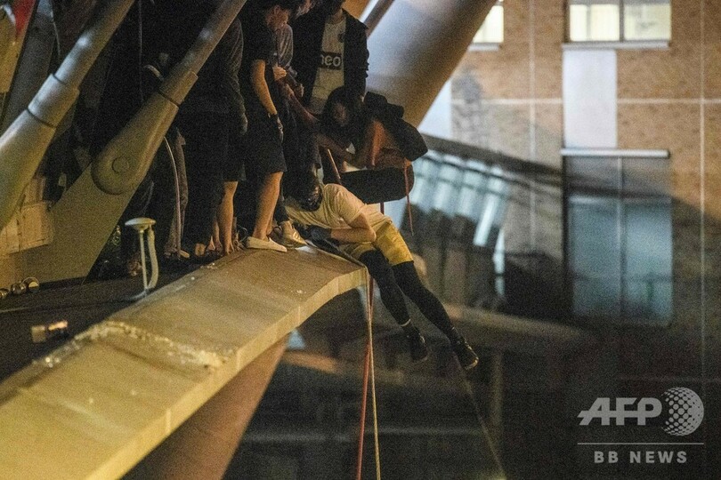 【11月18日 AFP】(写真追加)香港で18日、民主派のデモ隊が占拠し、当局に包囲されていた大学から、数十人のデモ参加者らがロープを伝って歩道橋から幹線道路に下りて脱出する様子が、AFPの動画に捉えられた。