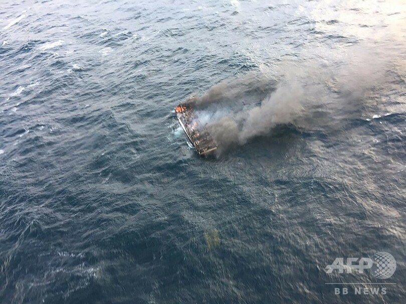 海洋警察庁は韓国人1人の遺体を収容したと発表。現在ヘリコプターや哨戒機のほか、沿岸警備隊の船舶、民間の漁船が行方不明者の捜索に当たっており、火災の原因は調査中だという。(c)AFP