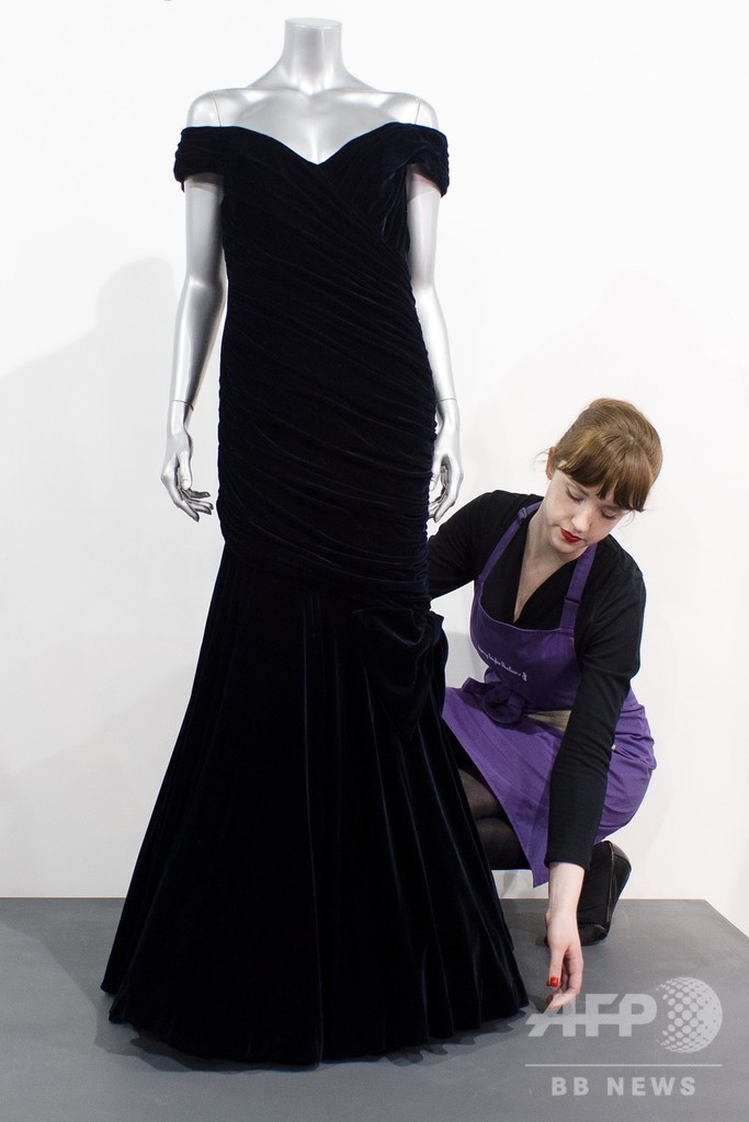 このドレスは、ダイアナ元妃自身が1997年6月のチャリティーオークションで出品した複数の服のうちの1着。元妃はこの競売の数週間後に、フランス首都パリで交通事故に遭い死去した。(c)AFP