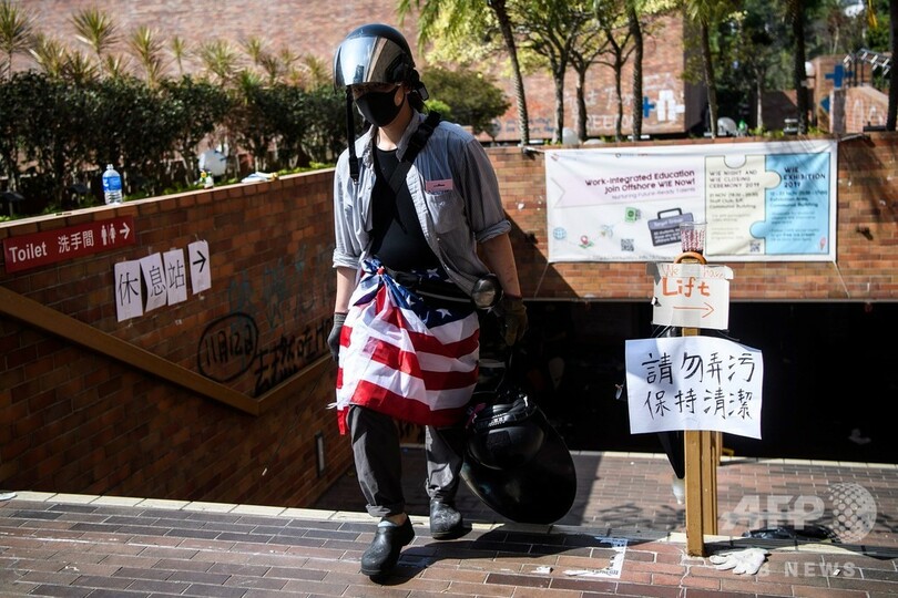 【11月21日 AFP】(写真追加)5日にわたり警察の包囲下にある香港理工大学(Hong Kong Polytechnic University)では21日、展開する警官隊の人数は目に見えて減少したものの、民主派のデモ隊のうち強硬派の数十人が籠城を続けている。
