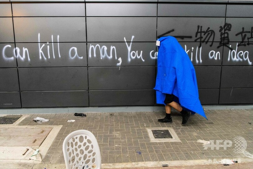 【11月21日 AFP】(写真追加)5日にわたり警察の包囲下にある香港理工大学(Hong Kong Polytechnic University)では21日、展開する警官隊の人数は目に見えて減少したものの、民主派のデモ隊のうち強硬派の数十人が籠城を続けている。