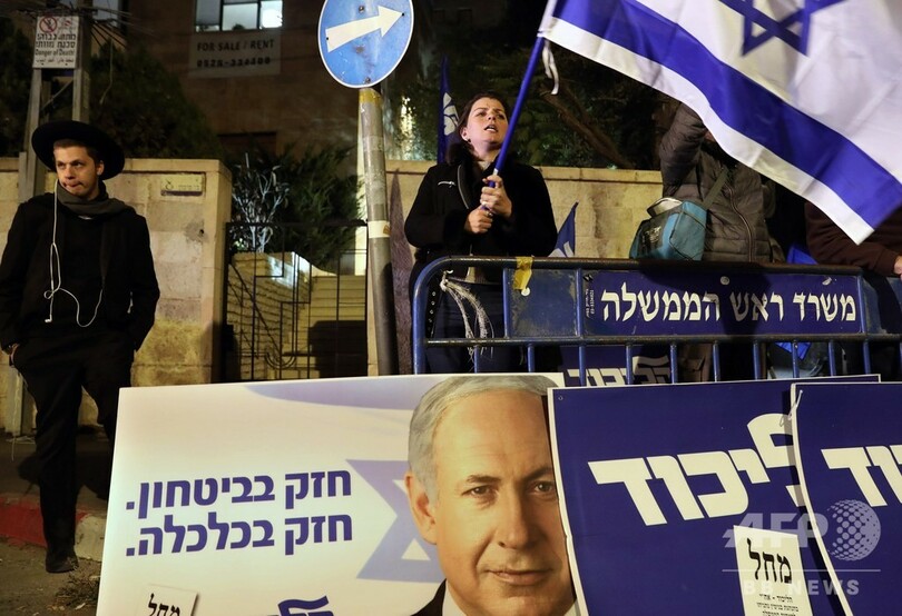 ネタニヤフ氏は法律上、有罪が確定するまで首相を辞任する必要はないが、政治的圧力は強まるとみられる。また、同氏が議会に不訴追特権を求める可能性もある。(c)AFP