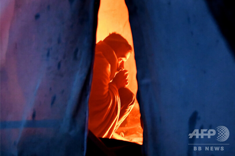 【12月2日 AFP】ボスニア・ヘルツェゴビナ北部ビハチ(Bihac)郊外にある難民キャンプ「ブチャック(Vucjak)」で、テントの中のたき火に当たる不法移民の男性。