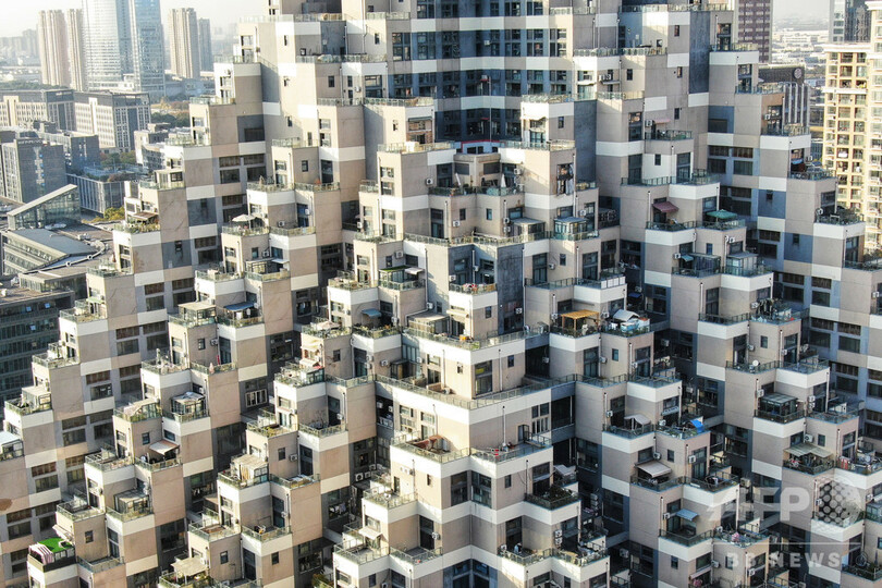 下から上に向かって幅を縮めていく斬新なデザインは、積み木のようにも見え、行きかう人々の目を釘付けにさせている。(c)CNS/JCM/AFPBB News