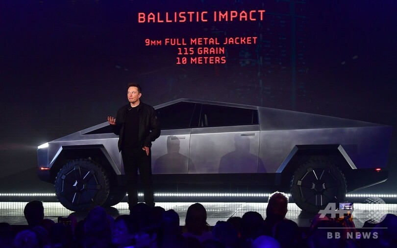 米カリフォルニア州で開かれた完全電気自動車「サイバートラック(Cybertruck)」の披露会では、車体を大きなハンマーでたたくという大胆なパフォーマンスが行われ、9ミリ銃弾にも耐えられることを示すビデオが公開された。