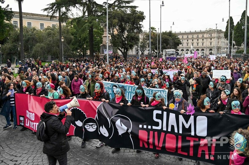 イタリアの首都ローマでも、女性を中心に多数がデモ行進に参加。主催した「Non Una de Meno!」によると、今年に入ってから94人の女性が現在か過去のパートナーに殺害されたという。