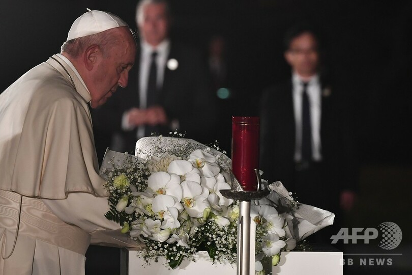 【11月24日 AFP】来日中のローマ・カトリック教会のフランシスコ教皇(Pope Franci)は24日午後、長崎から広島に移動し、市内にある平和記念公園で核兵器の使用は「犯罪」だと訴えた。
