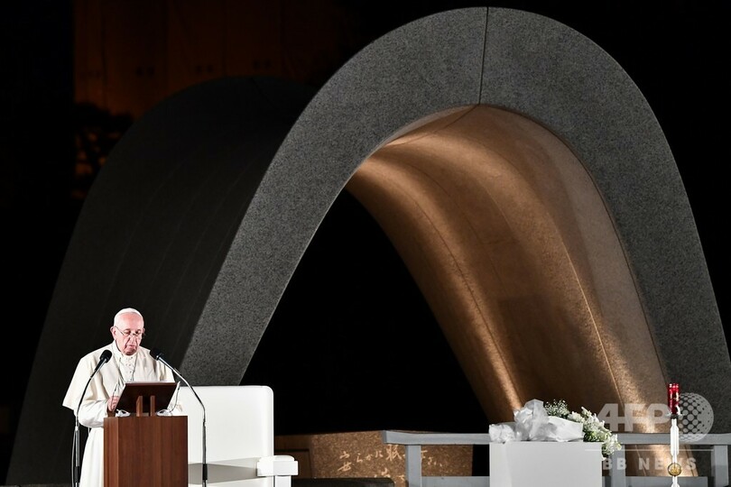 教皇は核兵器のない世界を呼び掛けることを旅の中心テーマに据え、4日間の訪日日程を二つの被爆地への訪問から開始。「平和の巡礼者としてここに来ることが務め」だと思うと語り、原爆投下から生き延び、その後心身の苦しみを耐えてきた被爆者たちの「強さと尊厳」に敬意を表した。(c)AFP/Catherine MARCIANO