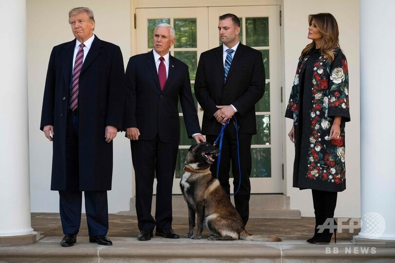 トランプ氏は、ホワイトハウス(White House)で行われた短い式典で、調教師のそばに座ったコナンを「素晴らしい」と称賛。「とても立派で、とても賢い。コナンは素晴らしい働きをした」と述べた。式典にはメラニア(Melania Trump)大統領夫人とマイク・ペンス(Mike Pence)副大統領も出席した。
