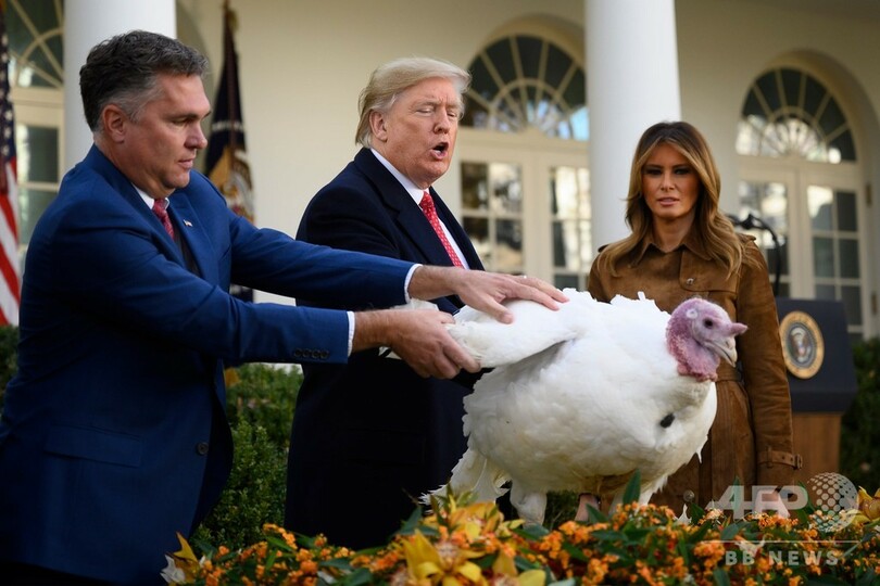 【11月27日 AFP】米首都ワシントンのホワイトハウス(White House)で26日、大統領が感謝祭の七面鳥に「恩赦」を与える毎年恒例の式典が行われた。式典では、ドナルド・トランプ(Donald Trump)大統領が自身に対する弾劾調査に絡め、七面鳥に対して証言を求める召喚状が出されたとのジョークを飛ばす一幕があった。