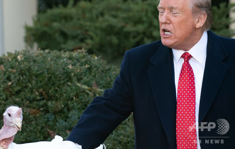 【11月27日 AFP】米首都ワシントンのホワイトハウス(White House)で26日、大統領が感謝祭の七面鳥に「恩赦」を与える毎年恒例の式典が行われた。式典では、ドナルド・トランプ(Donald Trump)大統領が自身に対する弾劾調査に絡め、七面鳥に対して証言を求める召喚状が出されたとのジョークを飛ばす一幕があった。