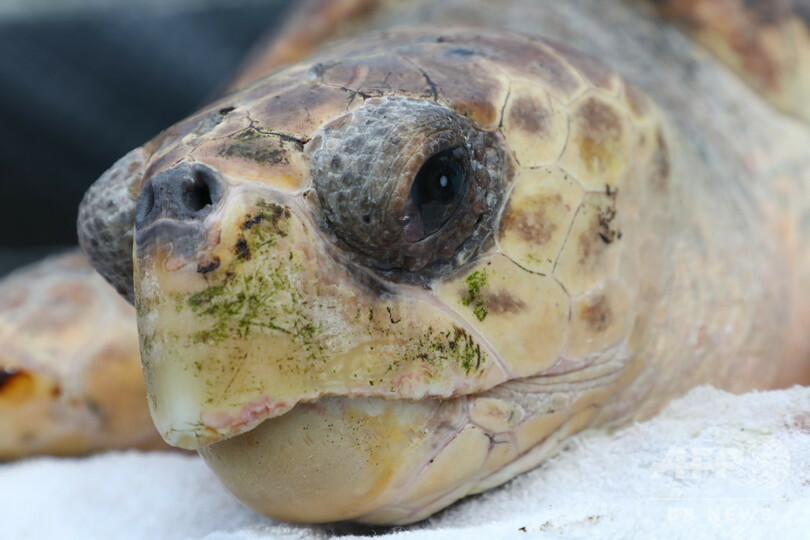 【今日の1枚】「辛抱してね」傷の手当てを受けるウミガメ