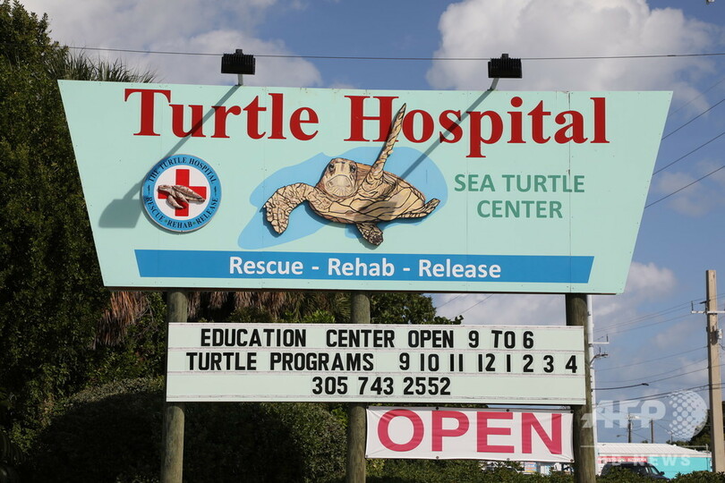 【12月5日 AFP】米フロリダ州マラソン(Marathon)にある「カメの病院(Turtle Hospital)」で、「ヒトデ(Starfish)」と名付けられたアカウミガメを治療するリハビリ担当者たち。ヒトデは、フロリダキーズ(Florida Keys)諸島で、サメの攻撃により傷を負った。