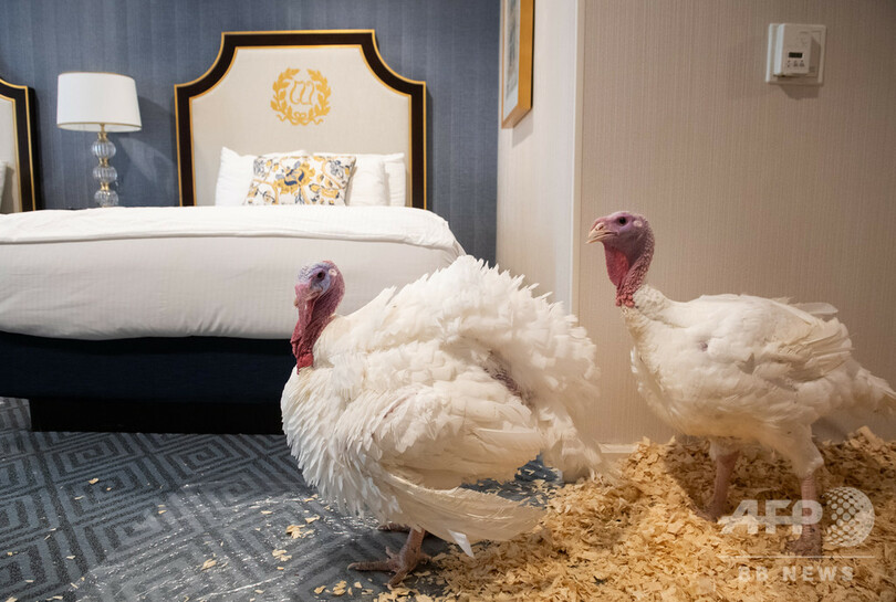 【11月28日 AFP】米首都ワシントンのウィラードインターコンチネンタル(Willard Intercontinental)ホテルの客室を歩く七面鳥のつがい、ブレッド(Bread)とバター(Butter)。