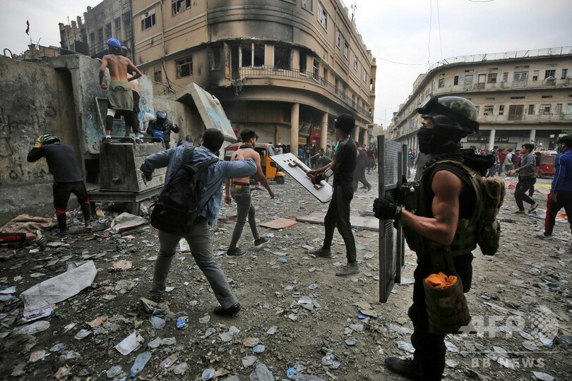 首都バグダッドと同国南部での抗議デモでは、2003年の米主導の侵攻によるサダム・フセイン(Saddam Hussein)政権崩壊以降のものとしては、最も多くの犠牲者が出ている。デモ参加者は政府と、政府への影響力を強めるイランに対し激しい怒りを向けている。27日夜には、自国の政治へのイランの影響に激怒したデモ隊が、イスラム教シーア派の聖地ナジャフ(Najaf)のイラン領事館に放火。「イラクに勝利を!」「イランは出て行け!」と連呼した。