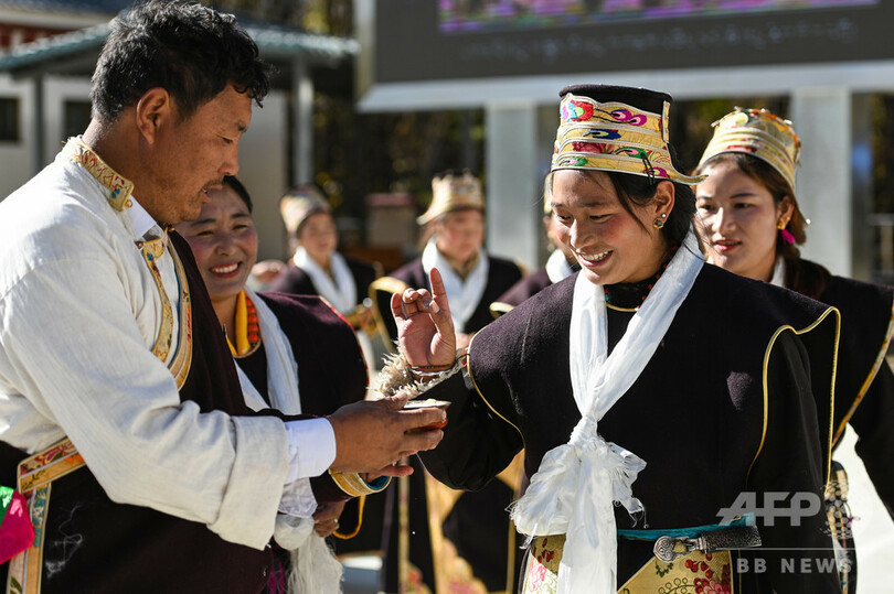民族衣装をまとった住民たちは青稞(ハダカムギ)酒で乾杯し、弓矢を競い合ったり、縁起の良い飾り物を出したり、盛大に正月を祝っていた。(c)CNS/JCM/AFPBB News