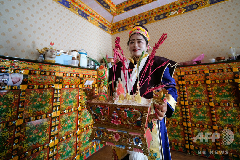 民族衣装をまとった住民たちは青稞(ハダカムギ)酒で乾杯し、弓矢を競い合ったり、縁起の良い飾り物を出したり、盛大に正月を祝っていた。(c)CNS/JCM/AFPBB News