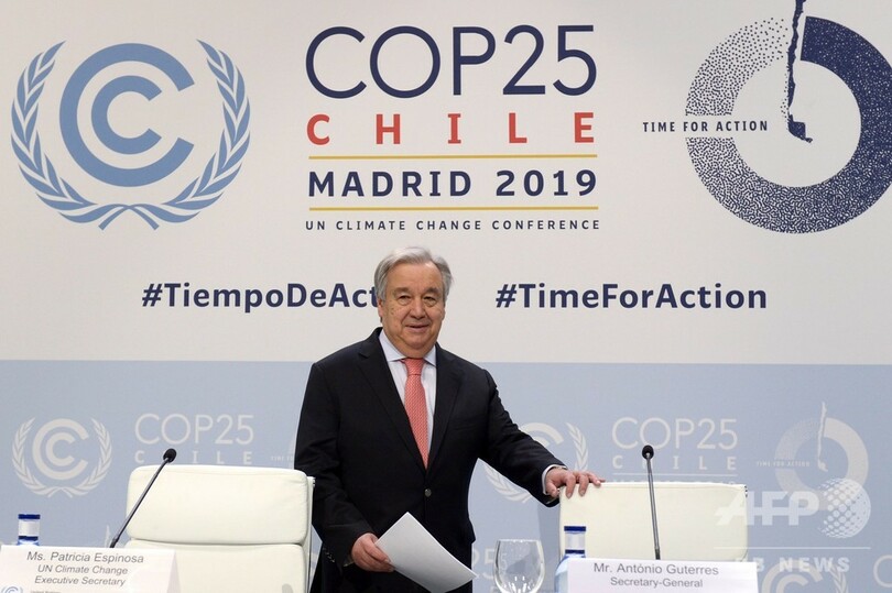 【12月2日 AFP】国連(UN)のアントニオ・グテレス(Antonio Guterres)事務総長は1日、気候変動枠組み条約第25回締約国会議(COP25)の開幕を前に記者会見し、人類を脅かしている地球温暖化の壊滅的な影響は、人類に痛めつけられている自然界からの抵抗だと警告した。196か国が集うCOP25は2日からスペイン・マドリードで開幕する。