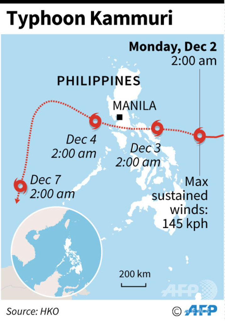 【12月2日 AFP】非常に強い勢力を伴った台風28号(アジア名:カンムリ、Kammuri)が、2日から3日にかけてフィリピンに上陸するとみられている。台風の接近を受けて同国では数万人が避難を余儀なくされたほか、首都マニラ近郊で開催中の東南アジア競技大会(SEA Games)への影響が懸念されている。