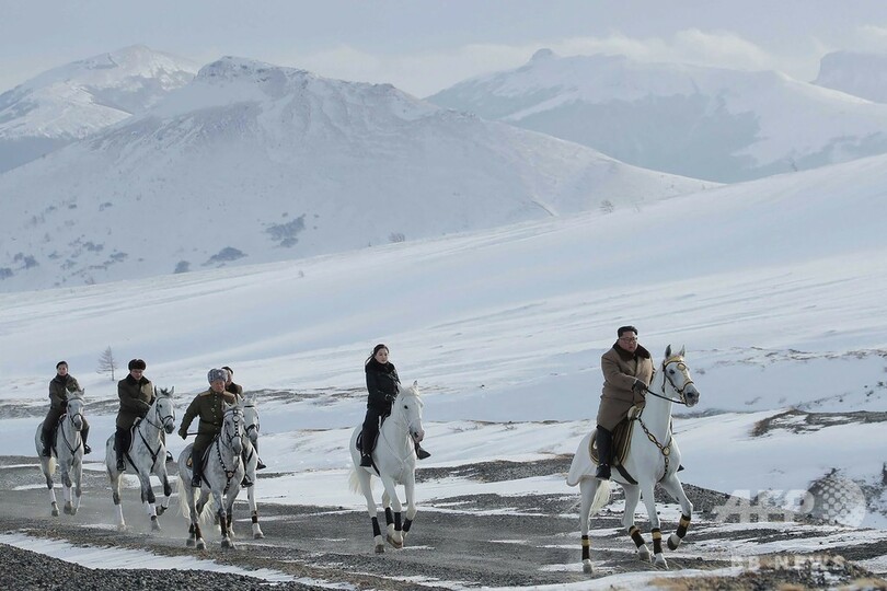 朝鮮中央通信(KCNA)は、白頭山近くの雪で覆われた森の中で、馬に乗った正恩氏が李雪主(リ・ソルジュ、Ri Sol-Ju)夫人や政府関係者ら一行を率いる写真を公開した。