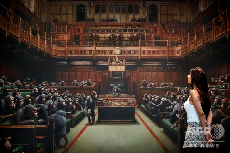 英国の欧州連合(EU)離脱をめぐる騒動が続く中、同国の覆面ストリートアーティスト、バンクシー(Banksy)の絵画「退化した議会(Devolved Parliament)」が競売に掛けられ、約1100万ユーロ(約13億円)で落札された。バンクシー作品としては過去最高額。同作は英議会の議員たちをチンパンジーとして描いている。