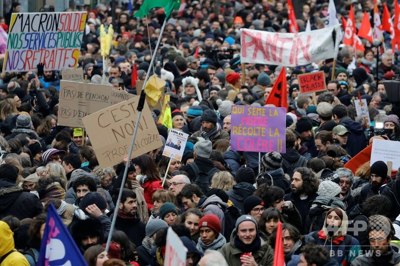 【12月5日 AFP】(更新、写真追加)フランスで5日、エマニュエル・マクロン(Emmanuel Macron)大統領の統一的な年金制度を目指す計画に抗議する複数の労働組合が全国規模の無期限ストライキに突入し、交通機関や学校、その他の機関が閉鎖された。組合側はこの改革により、多くの国民がより長い年数働かざるを得なくなると訴えている。同日には複数の都市で抗議活動が行われ、数千人が参加した。