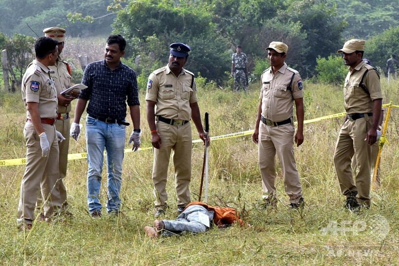 【12月6日 AFP】(写真追加)インド南部ハイデラバード(Hyderabad)で27歳の女性獣医師が男らに拉致されレイプされた後、殺害されて遺体を焼かれた事件で、警察は6日、容疑者として身柄を拘束していた男4人を射殺したと明らかにした。事件の検証中に逃走しようとしたためだという。警察の短絡的な措置に怒りの声もあるが、人々は容疑者の死に歓喜し、インド各地がお祝いムードにあふれている。