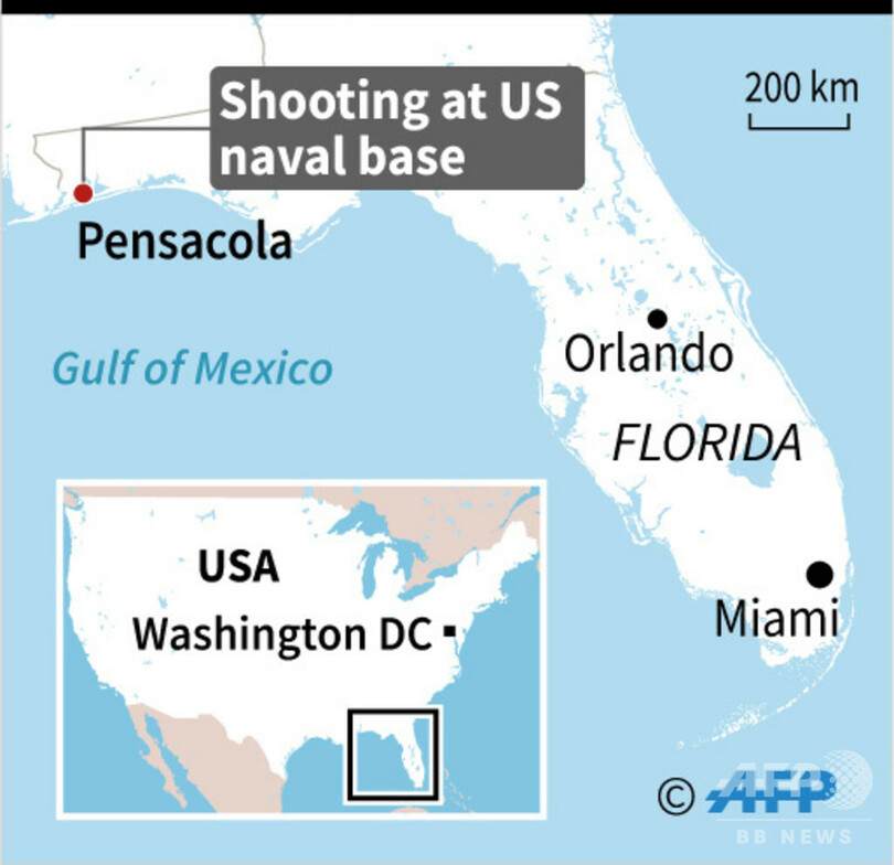 【12月7日 AFP】(更新、図解追加)米フロリダ州ペンサコラ(Pensacola)の海軍航空基地で6日、銃撃があり、3人が死亡、8人が負傷した。犯人はサウジアラビア空軍の訓練生で、警察に射殺された。サウジアラビアのサルマン国王(King Salman)は直ちにドナルド・トランプ(Donald Trump)米大統領に対して哀悼の意を伝えた。
