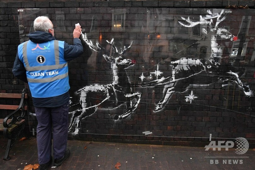 バンクシー新作はベンチを引くトナカイ 街をにぎわす 英
