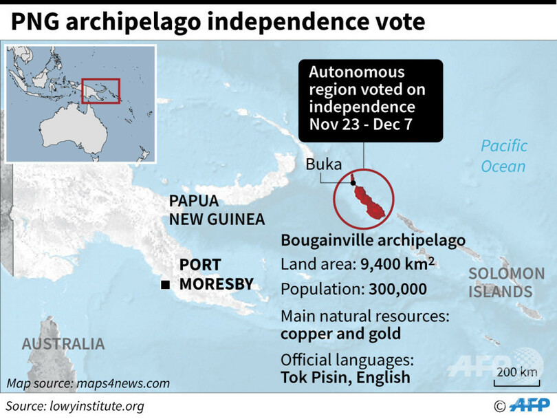 【12月11日 AFP】(更新)太平洋に浮かぶ島しょ国パプアニューギニアのブーゲンビル(Bougainville)自治州で11日、独立の是非を問う住民投票の開票結果が発表され、住民の圧倒的多数が賛成に票を投じていたことが分かった。新国家誕生へ大きな一歩となる結果だ。